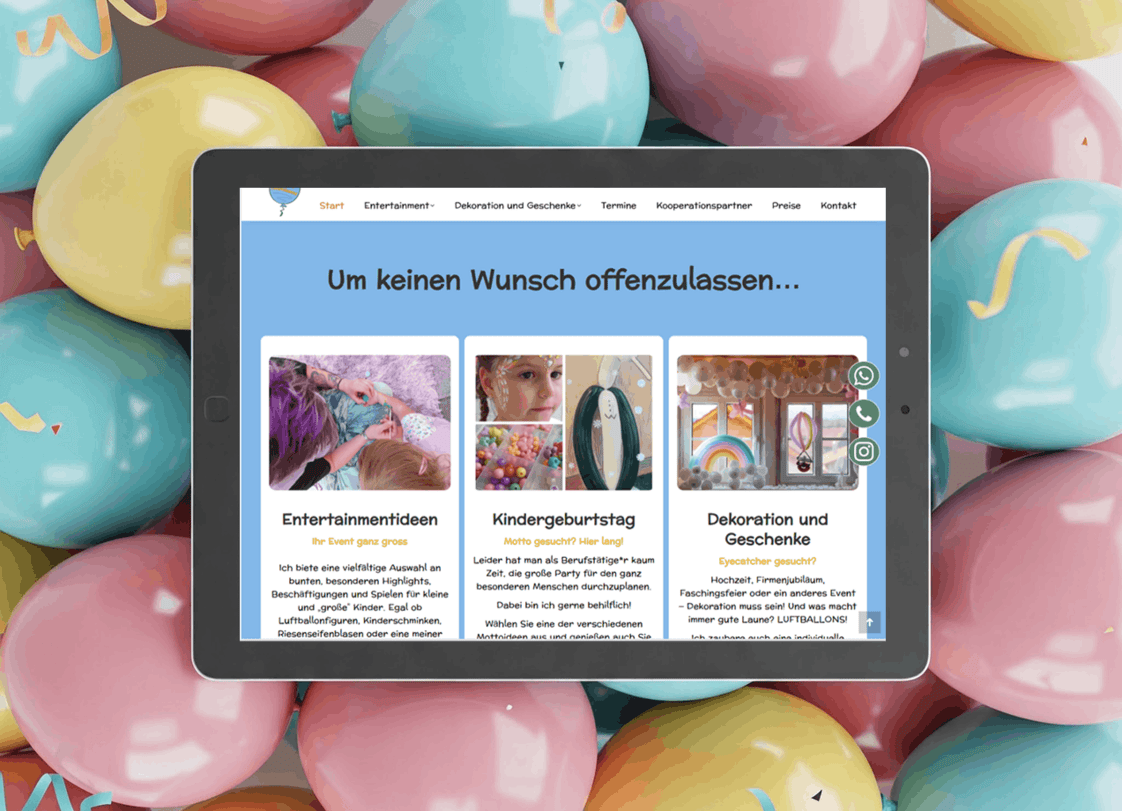 Die Umstellung der Webseite ermöglicht es nun auch gezielt die jeweiligen Leistungen zu präsentieren. Egal ob Dekorationen, Auftritte oder Kindergeburtstage jedes Angebot kann nun individuell im besten Licht präsentiert werden. Besucher können so ansprechender informiert werden und sich damit eine bessere Meinung bilden.